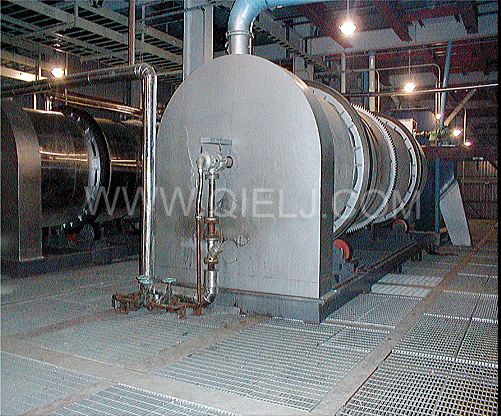 軟化工序:采用YRHW系列臥式軟化鍋,通過進料絞龍進入軟化轉筒內,隨著轉筒的轉動,物料得到不斷的翻動,由于轉筒內裝有加熱列管,列管內通有蒸汽,因此物料在隨著轉筒不斷翻動的同時,將大豆加熱到50-70℃,使其充分軟化,提高大豆原料的塑性,使軋胚機軋出的胚薄而不碎,從而提高浸出效果。轉筒帶有進料端高、出料端低的傾角,根據物料的軟化情況,通過調速裝置調節轉筒的轉速,可以控制物料在轉筒內的軟化時間,使物料的軟化效果達到理想狀態。
