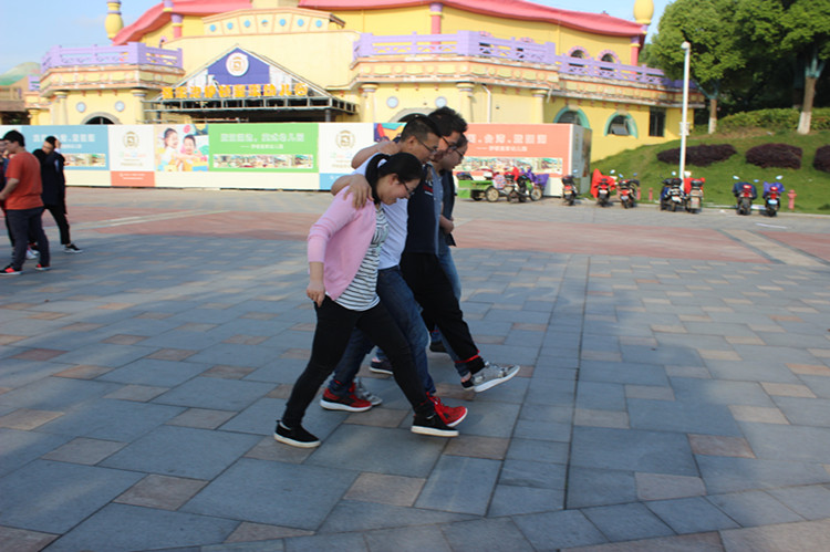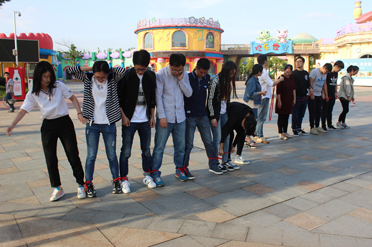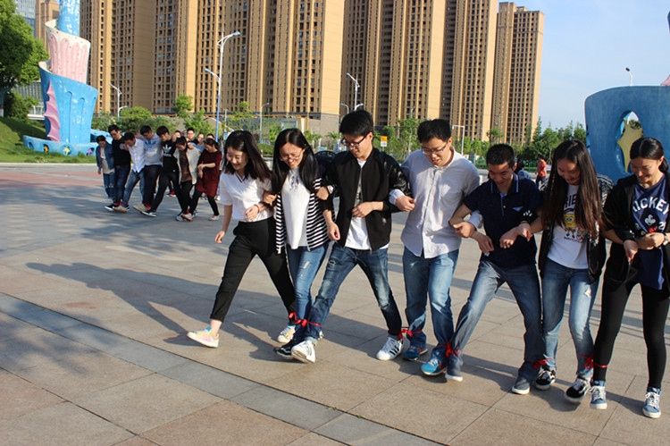 步驟:以小組為單位,共4組,抽簽決定,兩兩PK,獲勝的兩對再進(jìn)行PK,決出第一名,其次為第二名,淘汰的兩個隊伍,按照其用時評出第三、第四名。相鄰的人把腿系在一起,一起跑向終點(diǎn),用時最短的勝出。