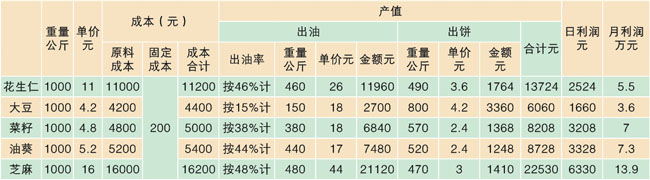 2. 出油率:每百斤出14斤油,油單價:5元/斤